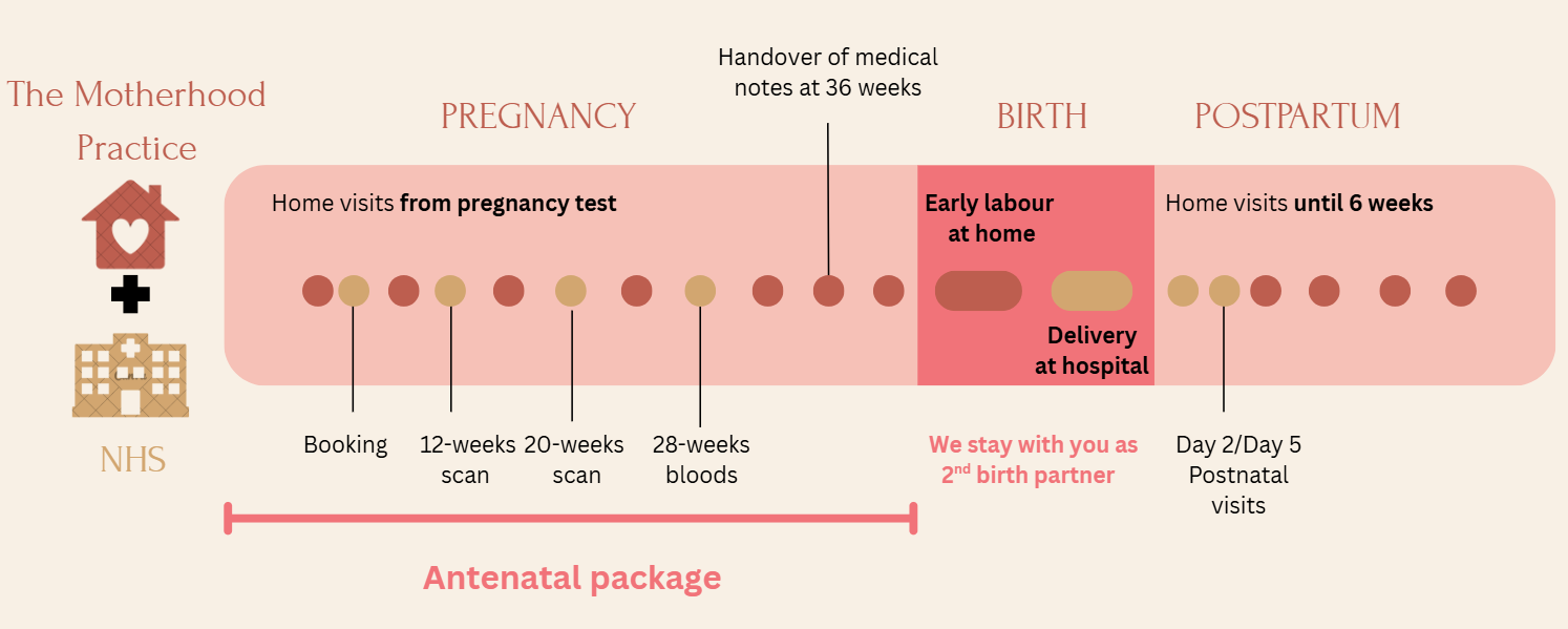 Get continuous support from your midwife at home throughout your pregnancy, complementary to the NHS.
