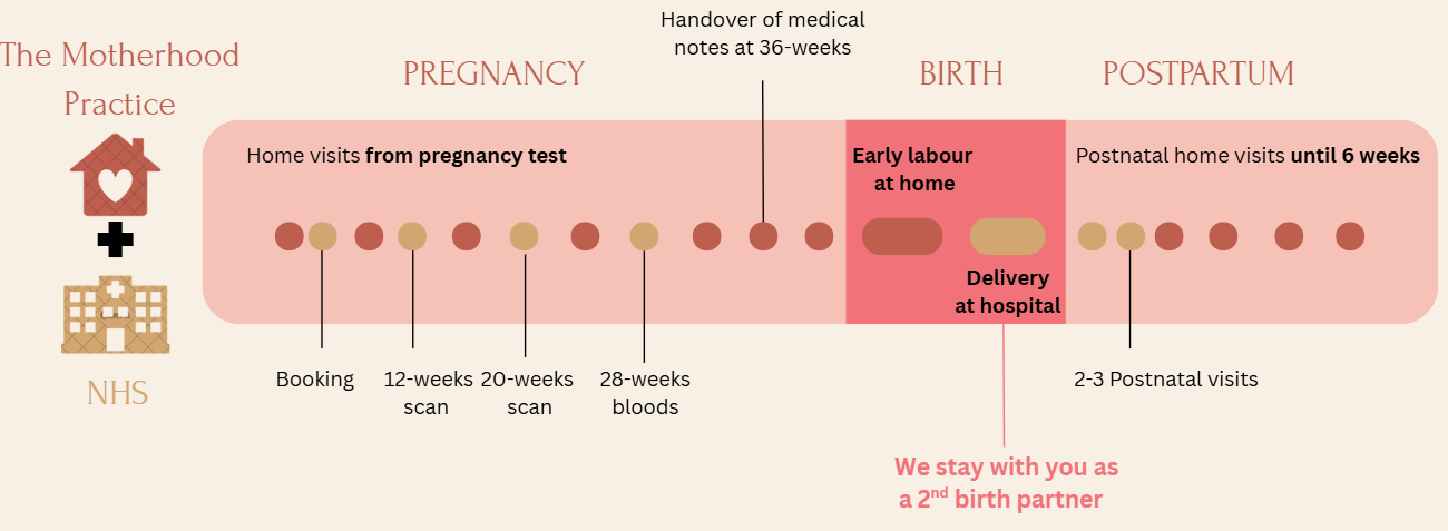 Our visits complement the NHS: all midwife appointments are delivered by The Motherhood Practice, whilst essential checks (booking appointment, scans, bloods) are delivered at the hospital. We avoid duplications with the NHS appointments. We follow the NHS guidelines to schedule appointments: monthly visits until 36 weeks, then bi-weekly and weekly after 38 weeks. Care can start when you find out you’re pregnant (vs 10-14 weeks at the NHS).